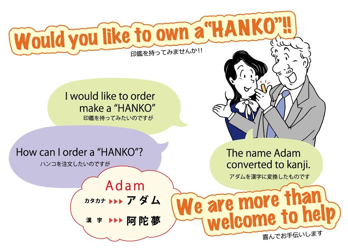 welcome to help. 一般的に外国人が印鑑を作成する時は「漢字変換したHANKO の出来合い印もありますが」原則注文生産になります。